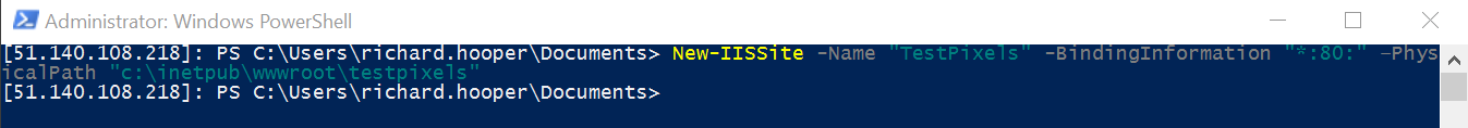 New-IISSite -Name "TestPixels" -BindingInformation "*:80:" -physicalPath "c:\inetpub\wwwroot\TestPixels" |