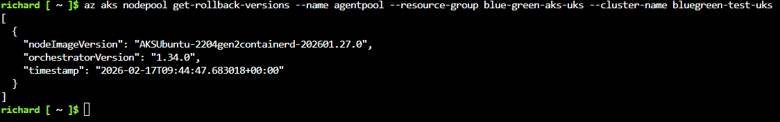 This queries the upgrade profile and surfaces the previously used versions. If the node pool hasn’t been upgraded at least once, there’s nothing to roll back to and the command will tell you so rather than returning a silent empty result.