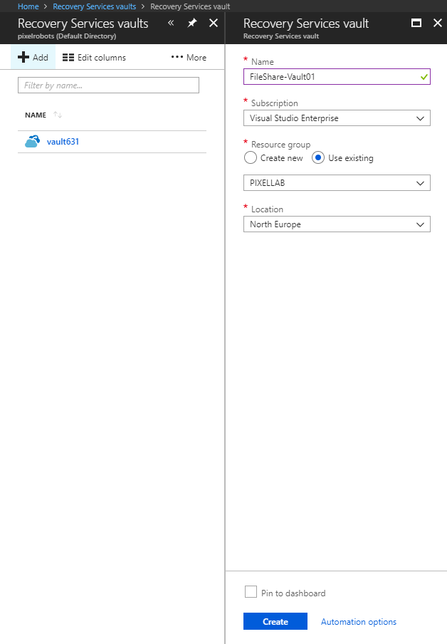 Enter a Name, pick you Subscription, select to either create a new Resource Group or use an existing, and finally select the location. Make sure you select the same location as your Azure File Share. Then click Create