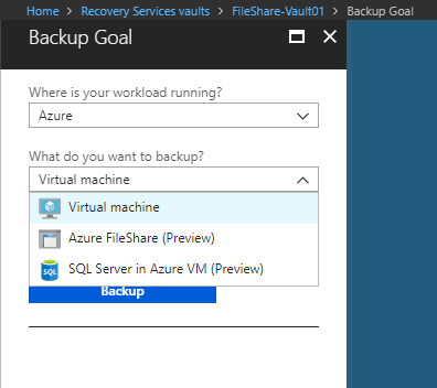 In the Backup Goal blade click on the What do you want to backup? drop down menu and select Azure FileShare and then click the Backup button.