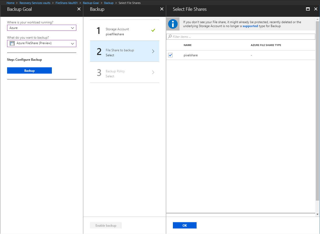 Once that has finished you will be able to select the File Share you want to backup. Put a tick in the box and press OK.