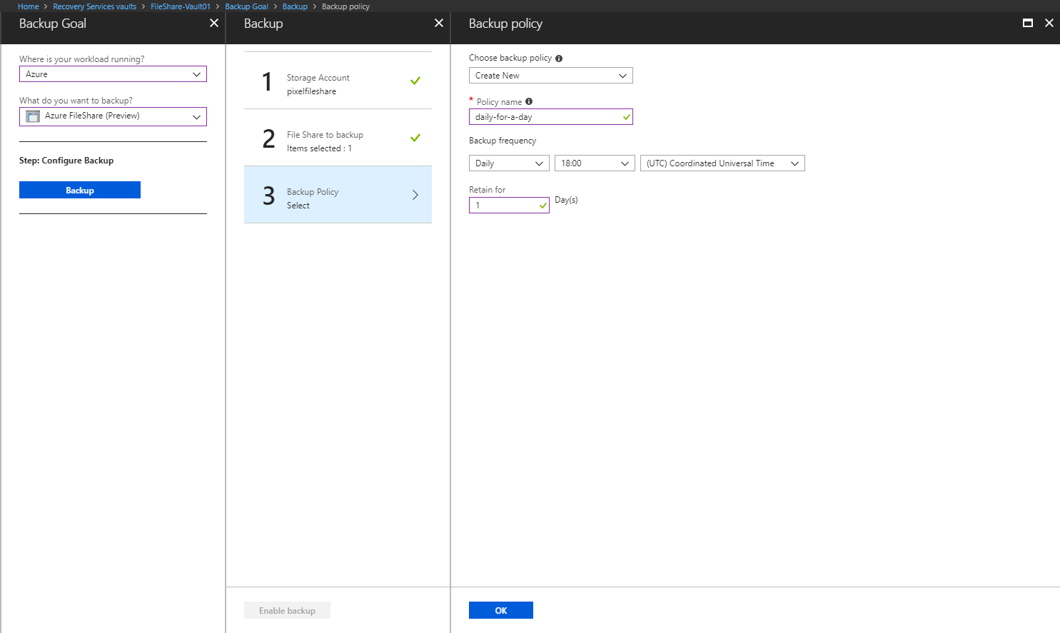 Now you can configure the Backup Policy You can either create a new one or use an existing. Just enter a Policy name and set the Backup frequency and how many days you would like to Retain the backup for. Then click OK.
